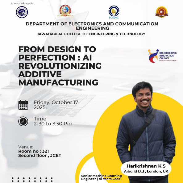 The expert talk titled From Design to Perfection: AI Revolutionizing Additive Manufacturing explores how artificial intelligence is transforming every stage of modern 3D printing from design optimization to precise manufacturing outcomes. Delivered by Mr. Harikrishnan K. S., AI Developer at Ai Build Ltd, London, the session provides valuable insights into cutting-edge AI tools, automation techniques, and their impact on the future of additive manufacturing. The talk is scheduled for October 17, 2025, from 2:30 PM to 3:30 PM.