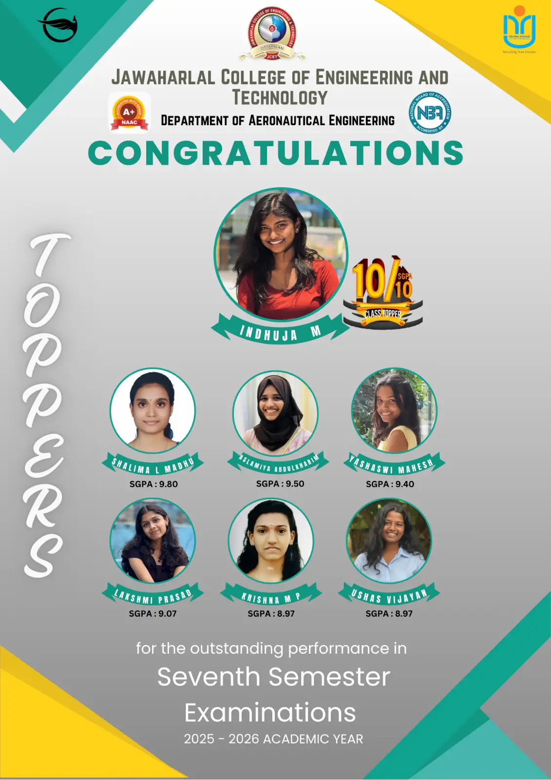 The Department of Aeronautical Engineering at Jawaharlal College of Engineering and Technology (JCET), functioning under the Nehru Group of Institutions (NGI), has established a strong tradition of academic quality and professional relevance, supported by the group’s legacy of over 51 years in education. The department holds the distinction of being the first in Kerala to introduce the B.Tech in Aeronautical Engineering, a programme launched in 2008 and accredited by the NBA.